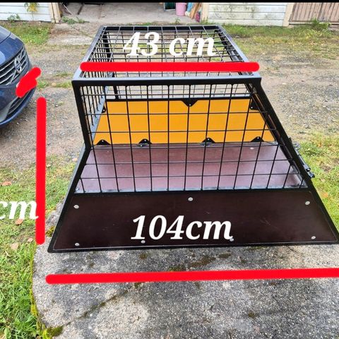 Leveys 653, korkeus 675, syvyys 830. Häkin ovi aukeaa ylöspäin ja ovea pitää ylhäällä kaasuvaimennin. Lukittava ovi ja kaksi avainta mukana. Saa siis jätettyä peräluukun auki ja koiran / koirat turvallisesti autoon.