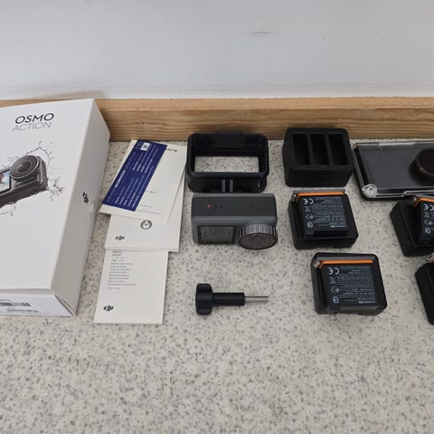 - Osmo Action x 2, elämää nähneet, näytöissä säröjä. Toisesta linssinsuoja halki, mutta ND-suodatin ajaa saman asian. Täysin toimivat kapistukset.