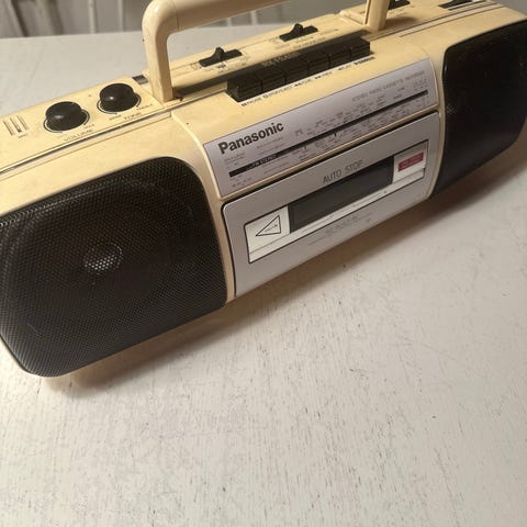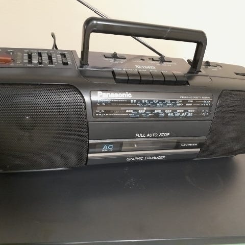 Siisti Panasonic RX-FS430, jossa radio toimii moitteettomasti. Kasettisoitinkin toimii, mutta kasetti pyörii hiukan venyttäen. Toimii verkkovirralla tai paristoilla. Paristokotelon kansi puuttuu.