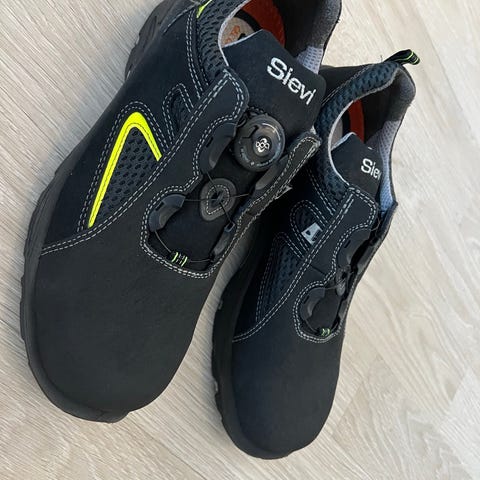 Sievi työkengät, koko 42. Mustat, nilkkapituiset nauhalliset kengät, joissa sivussa vetoketju. Kengissä on vahvistettu kärki ja paksu, kuvioitu ulkopohja. Soveltuvat työ- ja ulkokäyttöön. Materiaali vaikuttaa olevan synteettistä tai nahkajäljitelmää, tarkempi materiaali ei tiedossa.