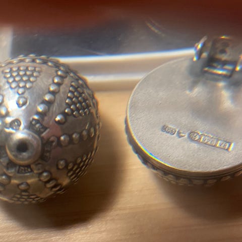Käytetyt, todella hyväkuntoiset korvakorut tapeilla. Korut ovat lähes samanlaiset, mutta eri vuosilta ja toisessa tappi on hieman pidempi. Tapit hieman vääntyneet ja toisessa takana pienen pieniä hiusnaarmuja. Kukanmuotoiset taustat mukana, joissa leima 925
