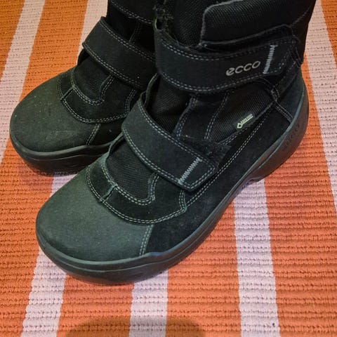 Kokoa 39 olevat Ecco-merkkiset talvikengät tai kevyet vaelluskengät Gore-Tex-kalvolla ja reippaasti kuvioiduilla kumpohjilla. Päällinen mokkanahkaa/tekstiiliä (ks. merkinnät kuvista). Jonkin verran vuoraustakin löytyy.
