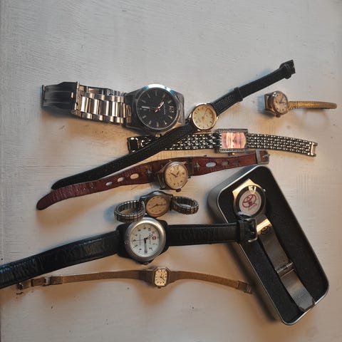 Kelloista sen verran, että kuvien 2-8 kellojen toimivuudesta en mene takuuseen. Osa toimii kyllä varmasti, mutta huoltoa vaativat varmasti jos hyvän haluaa. Kuvien 9-13 kellot ovat toimivia paitsi orientista en osaa sanoa koska siinä ei ole patteria paikallaan, eikä itseltä löydy siihe sopivaa.