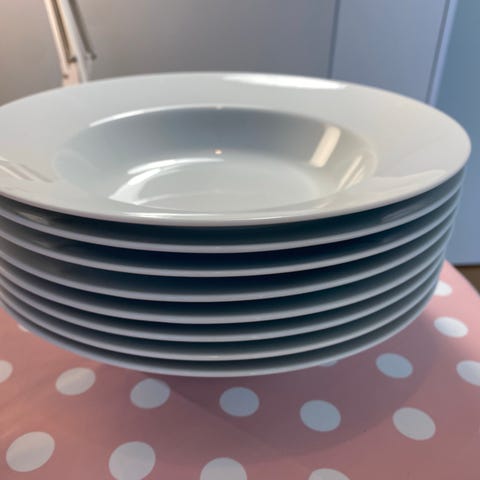 Syvät pasta lautaset, tarjoilulautanem 1kpl. 36cm. Ruokailulautaset 4kpl 26cm. valkoista posliinia tai keramiikkaa, joissa on siniset reunusraidat. Sopivat esimerkiksi keitoille, pastalle tai muille ruokalajeille.