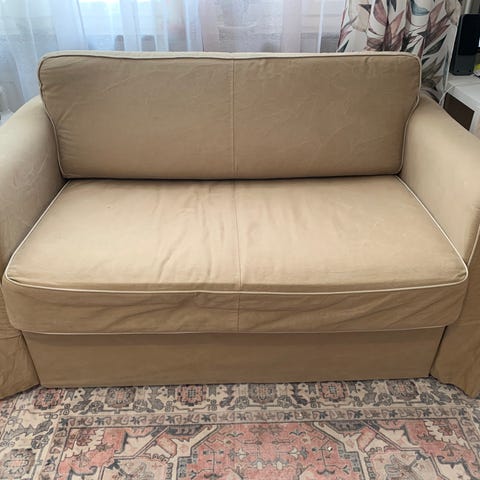 Kankaan sivuosassa on pieniä naarmuja/kulumaa, jotka on selkeästi kuvattu ilmoituksen kuvissa. Muuten sohva on erinomaisessa kunnossa eikä siinä ole mitään vikaa.