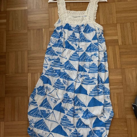 Myyn erinomaisessa kunnossa olevan Ivana Helsinki Moomin kesämekon. Koko 34. On malliltaan väljä ja itse olen käyttänyt tätä vaatekoossa ollessani itse kokoa S-M. Voin ottaa tarvittaessa mittoja. Materiaalina viskoosi. Mekossa on kirjavan sävyinen, sinivalkoinen Muumi-aiheinen kuosi. Yläosassa on virkatun näköinen, vaalea olka- ja rintamuskappale. Hihaton malli, kevyt ja laskeutuva materiaali sopii kesäkäyttöön.