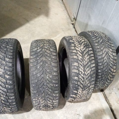 Myydään hyväkuntoiset ja tasaisesti kuluneet Nokian Hakkapeliitta nastarenkaat koossa 205/55 16