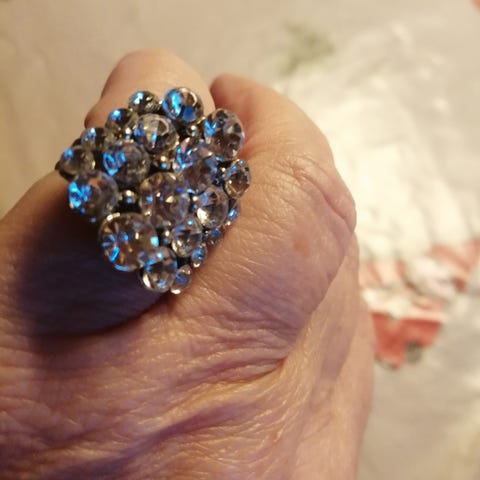 Iso hopean värinen sormus, jossa oranssi koriste. Jotain korumetallia.