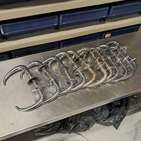 Hyväkuntoinen, valkoinen ovenkahvapari. Design by Timo Sarpaneva. Mukana tarvittavat osat asennukseen (lukitustapit teipattuna kahvaan, ei näy kuvassa)