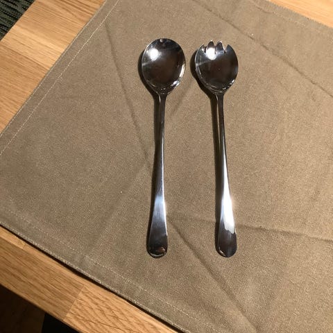 Kerran tai kaksi käytössä olleet Sheffield England salaattiottimet. Hiuksenhienoja käytön jälkiä voi esiintyä.