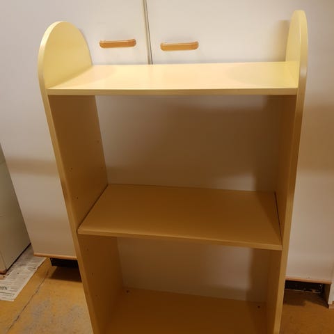 Hyllyt sinapinkeltaiset. Tuet vihreänruskean sävyiset. Hyvässä maalissa, jokunen pieni jälki voi olla. Ylimmän hyllyn takaosassa ruuvinreijät, mistä on ollut kulmaraudoilla kiinni seinässä.