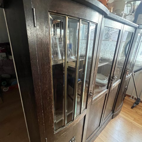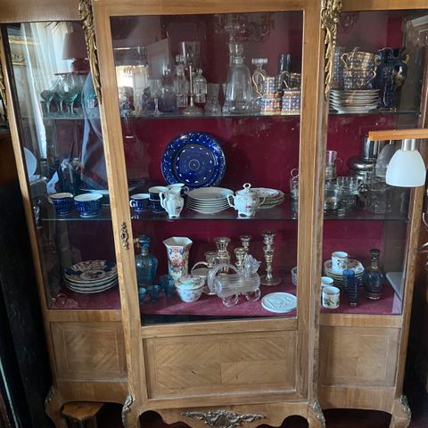 Vitriinikaappi tummaksi käsitellystä puusta. Yläosassa on lasiovet ja avohyllyjä, alhaalla kaappi- ja laatikkotilaa säilytykseen. Sopii esimerkiksi astioiden, koriste-esineiden tai muiden tavaroiden esillepanoon ja säilytykseen olohuoneessa, ruokailutilassa tai keittiössä.