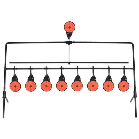 Tämä automaattisesti nollautuva pyörivä maalitaulu sopii kilpailuihin tai kohdeharjoitteluun. Ammu 4 alempaa kohdetta ensin ja keskimmäinen kohde lopuksi nollataksesi sen automaattisesti ilman, että sinun tarvitsee kävellä sen luokse. Kirkkaan oransseilla tarroilla varustetut kohteet on erittäin helppo nähdä kaukaa.