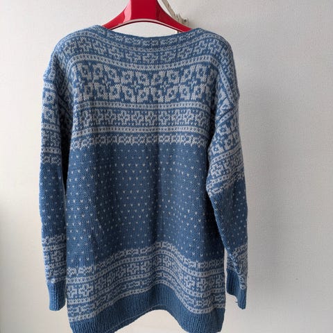 Käsin neulottu villapaita, ei mikään todella paksu. Väri on harmaa (aavistuksen kirjava, kuten usein villalankakin on). Tätä villapuseroa on käytetty vain muutama kerta eli LÄHES UUSI. Pituus olalta helmaan reilut 75 cm ja kainalo-kainalo n. 55 cm , mutta venyy n. 70 senttiseksi. Venyy, sillä neulos ei ole mitään tiukkaa. Lanka on lähes kokonaan villaa