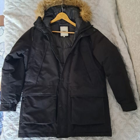 Uusi miesten talvitakki kokoa L, mutta vastaa paremmin kokoa M. Hupullinen.