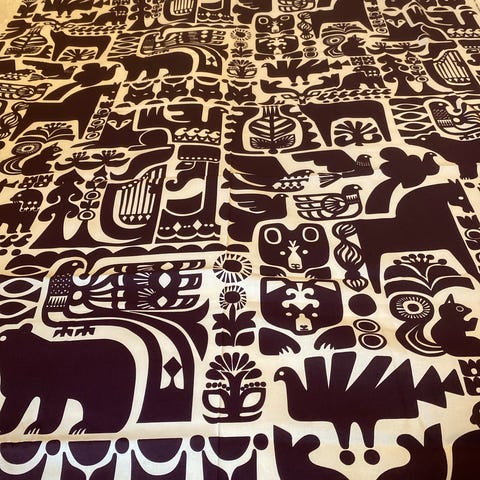 Marimekko Kanteleen kutsu kangas. Kuosissa on eläin- ja kasviaiheisia kuvioita ruskean/violetin ja valkoisen sävyissä. Materiaali on 100 % puuvillaa. Kaksi kpl 2,5 metriä. Hinta 10e/metri eli yhteensä 50e.