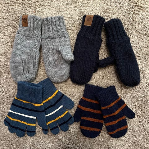 Viini punaiset talvihanskat, koko 5. Aika pienet, meillä sopi 5-6v lapselle. Kulumaa ja sormissa pienet reiät, sopivat ehkä kakkoshanskoiksi jollekin.