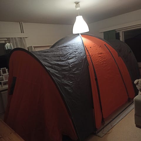 Kyseessä periaatteessa yhden hengen vaellusteltta, mutta sellaisena se ei toimi käytännössä kehnon ilmanvaihdon vuoksi - kosteutta tiivistyy yöllä katon sisäpuolelle. Retkeilykäytön sijaan teltta sopinee mainiosti lasten kesäisiin pihaleikkeihin majaksi, päikkäriluolaksi, lueskelupaikaksi jne. Helppo pystyttää nurmikolle. Telttaa on käytetty yhtenä yönä nukkkumiseen, lue käyttökokemus täältä: https://kavelija.blogspot.com/2025/02/lapin-muulit-ja-kissamies.html?m=0. Lisätietoja teltan ominaisuuksista löytyy täältä: https://www.amazon.de/-/en/dp/B09TFBJTGF?ref_=ppx_hzod_title_dt_b_fed_asin_title_0_0
