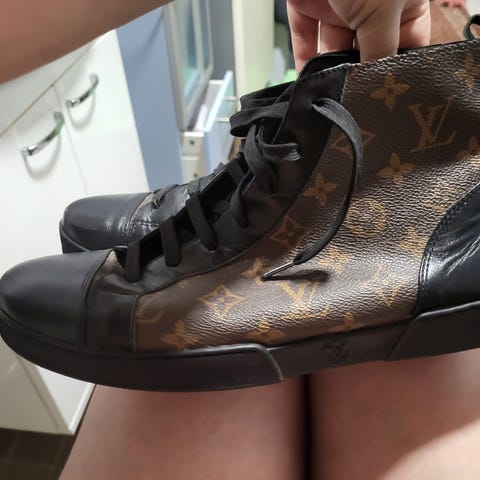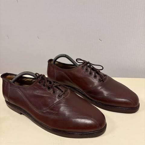 Teetetyt nahkaiset ulkokengät korkealla lestillä erityistarpeeseen. Koko arviolta 48, vertailuna vieressä oli 46 koon kengät ja ne olivat reilusti pienemmät.