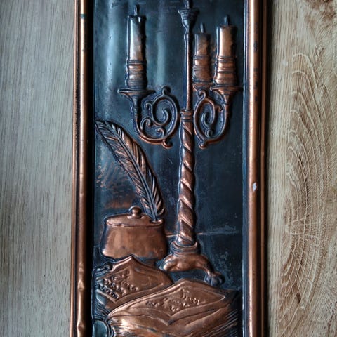 Kuparipakotetyö. Koko n. 24,5 x 34,5 cm. Kupari on kolmesta kulmasta rikkoutunut.
