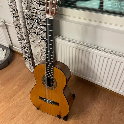 Admira Alba akustinen kitara. Kokonaispituus 100cm. Yksi kieli vaihdettu (D). Mukaan saa kitarankantolaukun ja halutessaan pari oppikirjaa (2. Kuva)