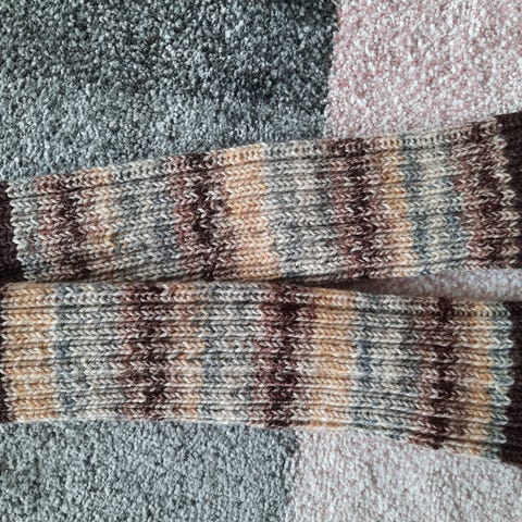 Itse neultut säärystimet. Pituus 37cm. Ympärys venyy helposti 40cm. Heijastin lankaa.