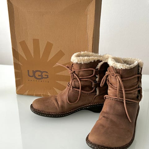 UGG talvikengät, koko 39 (sisämitta 24,5). Ruskeat nilkkapituiset kengät, joissa paksu turkisreunus varressa. Päällinen mokkamainen, pohjassa uritettu kumipohja paremman pidon takaamiseksi. Sopivat kylmään säähän arkikäyttöön.