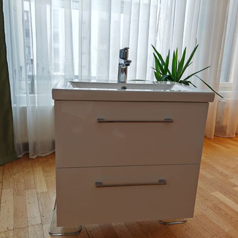 Kylpyhuoneen allaskaappi integroidulla pesualtaalla. Yläosassa on valkoinen pesuallas ja taso, alaosassa kaksi vetolaatikkoa puunsävyisillä etupaneeleilla ja pitkillä vetimillä. Allaskaappi on seinään kiinnitettävä malli. Soveltuu kylpyhuoneeseen tai wc-tilaan pesualtaaksi ja säilytystilaksi hygieniatarvikkeille ja muille pientavaroille.