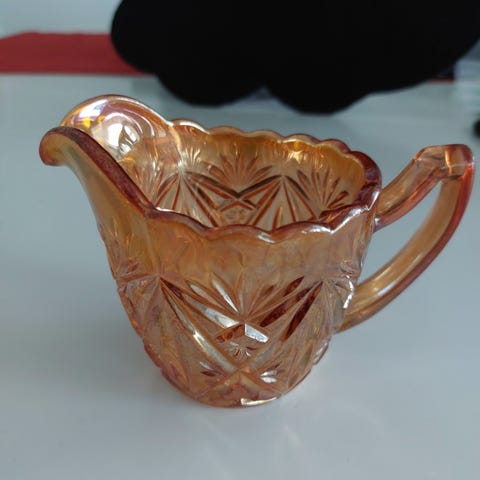 Riihimäen lasi (1941-1949) lysterilasi / myrkkylasi kermakko ja sokerikko. Väri oranssi. Sokerikko korkeus 4,2 cm, halkaisija 9,3 cm. Kermakko korkeus 5,8 cm ja halkaisija 8 cm