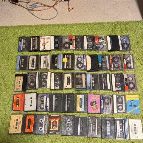 Supertehomagneetilla tyhjennettyjä erilaisia 60min kasetteja. Paperit putsattu niistä joista on.