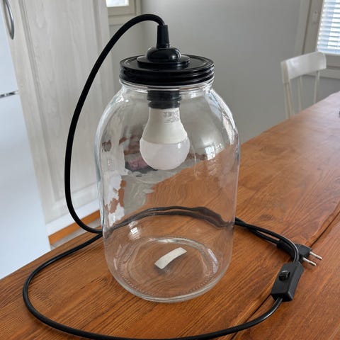 Myydään hehkulamppu aiheinen setti. Hehkulampun muotoinen valaisin, poltin tulee mukana. K50cm L27cm.