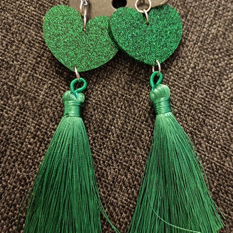Näyttävät sydänkorvikset glitterakryylista. Pituus n. 14 cm.