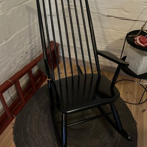 Komea korkealla selkänojalla varustettu 50-luvun musta keinutuoli myytävänä. Runko ja pinnat kaikki tukevia eikä tuoli kitku. Kuluneisuutta käsinojissa sekä jaloissa. Pinnoissa muutamia kolhuja.