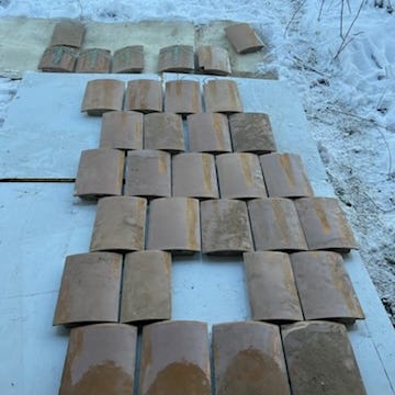 Turun kaakelitehtaan uuni nro 13, ns.vilja uuni (kuvionti). Kaikki osat tallella ja lisäksi yksi varakaakeli. Kaakelit on numeroitu. Aiemmin ollut pystytettynä nurkkaa siten että toinen sivuista ollut kiinni seinässä ja toisella puolella pidempi sivu. Mahdollista muurata tästä myös ns. kulmauuni, siirtämällä toiselta sivulta yhdet kaakelit toiselle puolelle. Vain vähäisiä vaurioita, ei haljenneita kaakeleita.
