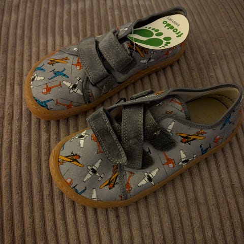Froddo poikien paljasjalkakengät, koko 30, pohjallisen mitta 20 cm (kuva). Sinisävyinen kuviollinen päällinen, jossa urheiluaiheisia kuvioita. Kengissä on kaksi tarranauhaa, jotka helpottavat pukemista ja säätämistä. Kumipohja on joustava ja siinä on kuviointi pidon parantamiseksi. Soveltuvat arki- ja vapaa-ajan käyttöön pojille. Käytetty sisäkenkinä kerhossa, joten huippu kuntoiset.