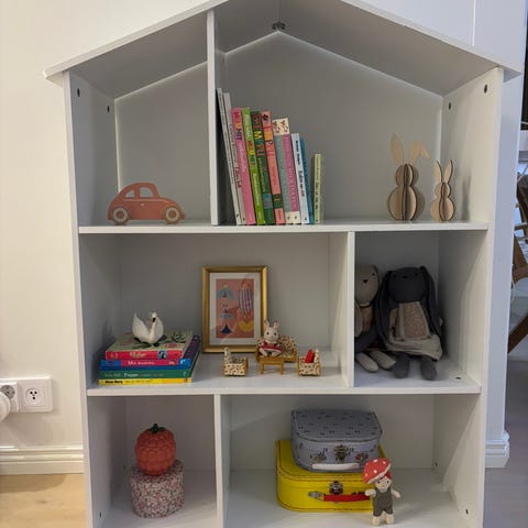 Tavaroiden/kirjojen säilytykseen tai nukkekotina toimiva hylly. Parissa hyllyssä pientä maalin kulumaa, muuten hyväkuntoinen ja ehjä. Mielellään nouto Tampereen Kalkusta.
