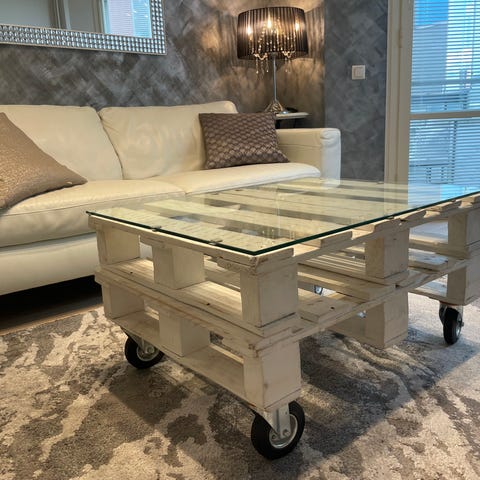 Itsetehty lavapöytä, päällä karkaistulasi, pyörät alla, siisti kuntoilen, sopii vaikka kesällä terassille, koko 79 cm x 119 cm