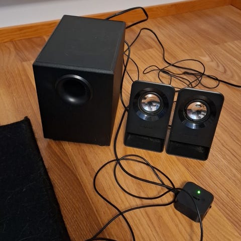 Logitech kaiutinjärjestelmä, johon kuuluu kaksi pöytäkaiutinta ja erillinen subwoofer. Väri on valkoinen. Takapaneelissa on liitännät äänilähteelle ja kaiuttimille. Soveltuu esimerkiksi tietokoneen tai muun äänilähteen kaiutinjärjestelmäksi kotikäyttöön.