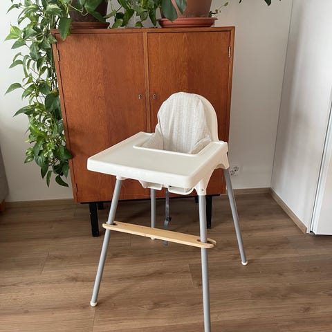 IKEAN Antilop-syöttötuoli, väri valkoinen. Ilman tarjotinta. Turvavyöt ovat käyttämättömät. Ollut mummolassa käytössä yhdellä lapsella, joten on käytetty varsin vähän.