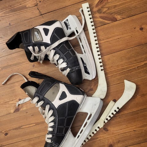 Koko ei oo 100% varma, en löytänyt mistään merkintää. Oma jalan kokoni on 37-38 joten oletan luistinten olevan sitä kokoa. Olleet pitkään käyttämättä, kannattaa terottaa ekana. Suojat tulee mukana.