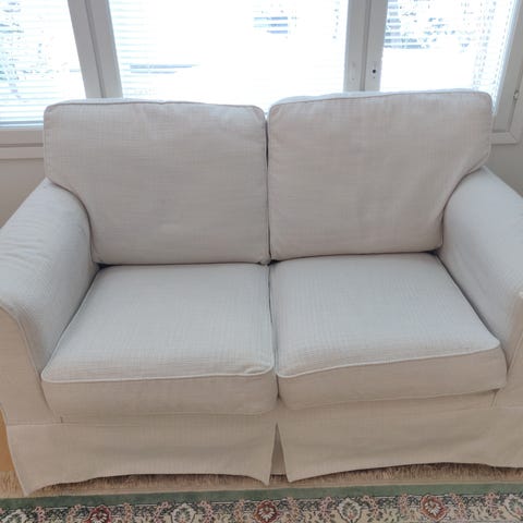 Hyväkuntoinen luonnonvalkoinen sohva. Päälliset irrotettavia sekä sohvassa että tyynyissä ja pestäviä (pesty säännöllisesti).