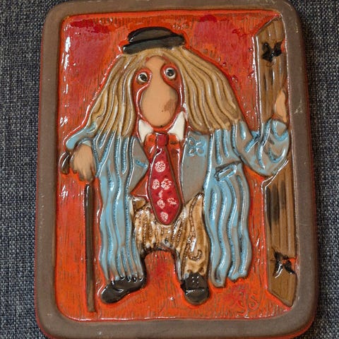 Tanskalsisen taiteilijan Björn Wiinbladin Björn Wiinblad for Nymölle Pottery of Denmark korkeakiiltoinen keraaminen seinätaulu joka kuuluu 1970-luvulla valmistettuun kalenteritaulusarjaan, JOULUKUU - MIRAAKKELI.