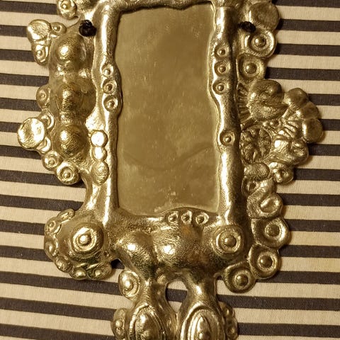 Abstrakti pyöreä reliefikoriste pronssinruskeaa metallia. Kaksipuolinen, molemmilla puolilla geometrinen ja orgaaninen kohokuviointi. Soveltuu esimerkiksi seinälle tai tasolle asetettavaksi taide-esineeksi tai sisustuselementiksi. Toivo Pelkonen 1975