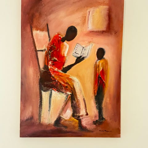 Tyttöjä kenkäheinien teossa. Angelilainen taiteilija. Mitat puukehyksineen 44 x 52 cm.