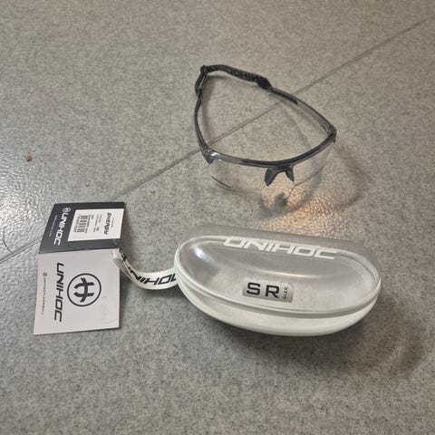 Eye Guard suojalasit. Väri musta–valkoinen–oranssi, kirkkaat linssit. Mukana muovinen säilytyskotelo ja irrotettava hihna, jolla lasit saa kiinnitettyä tukevammin päähän. Muutamaan kertaan sählyssä käytetty. Lasten/nuorten koko.