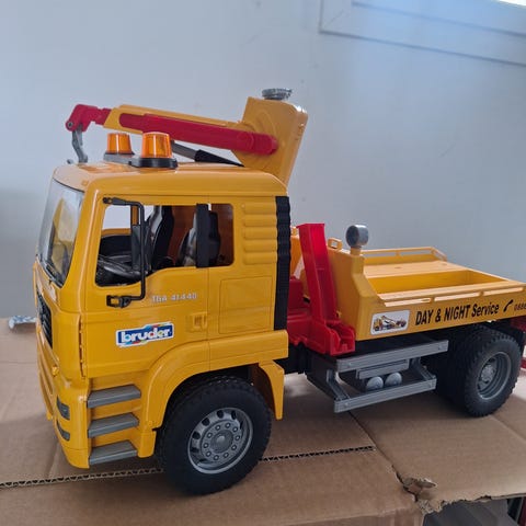 Bruder lelu kuorma-auto. Valkoinen kuorma-auto, jossa punaiset yksityiskohdat ja suuret renkaat. Peräosa on suunniteltu maa-ainesten ja muiden pienten esineiden kuljettamiseen leikeissä. Soveltuu lasten leikkeihin sisällä ja ulkona valmistajan ohjeiden mukaan.