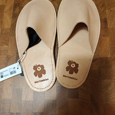 Nahkaiset Unikko-tohvelit, käytetty kerran kylpyläreissulla.