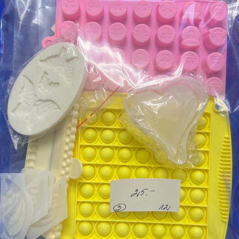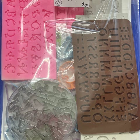 Valikoimassa on erilaisia muotteja, leikkureita, sabluunoita, silikonimuotteja, fondanttityökaluja ym. – jokainen pussi sisältää erilaisen määrän tuotteita.