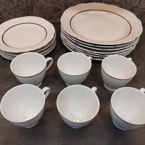 Myydään Virosta 30 vuotta sitten ostettu neuvoliittolaisen keramiikkatehtaan tuotantoa oleva pieni astiasto, jossa neljä kahvikuppia ja lautasta, sekä sokerikko että teekannu. Yhdessä lautasessa ja yhdessä kahvikupissa reuna hiukan nirhautunut. Teekannun sisusta täysin ehjä. Pohjassa oleva leima viittaa vain neuvostoliittolaiseen tuotantoon, mutta tehdas on tuntematon. Tuskin kestävät konepesua. Kuvio pilkullinen kelta-valkoinen. Voin postittaa tai nouto Helsingissä.