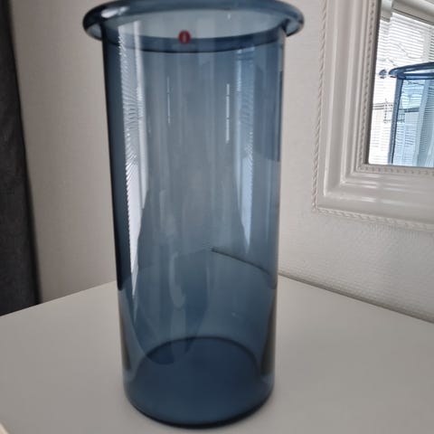 Iittala Juno lasimaljakko sinistä lasia. Sylinterimäinen muoto ja ulospäin levenevä reuna. Korkeus 20 cm, halkaisija 16 cm. Sopii esimerkiksi kukkamaljakoksi tai sisustusesineeksi. Klassinen Iittalan punainen logo maljakon yläosassa.